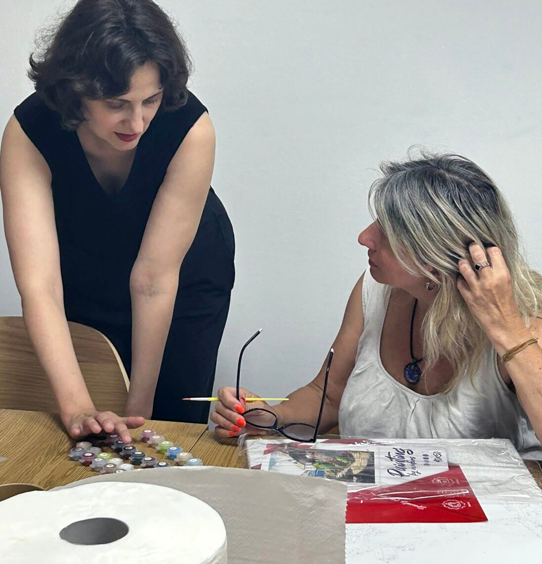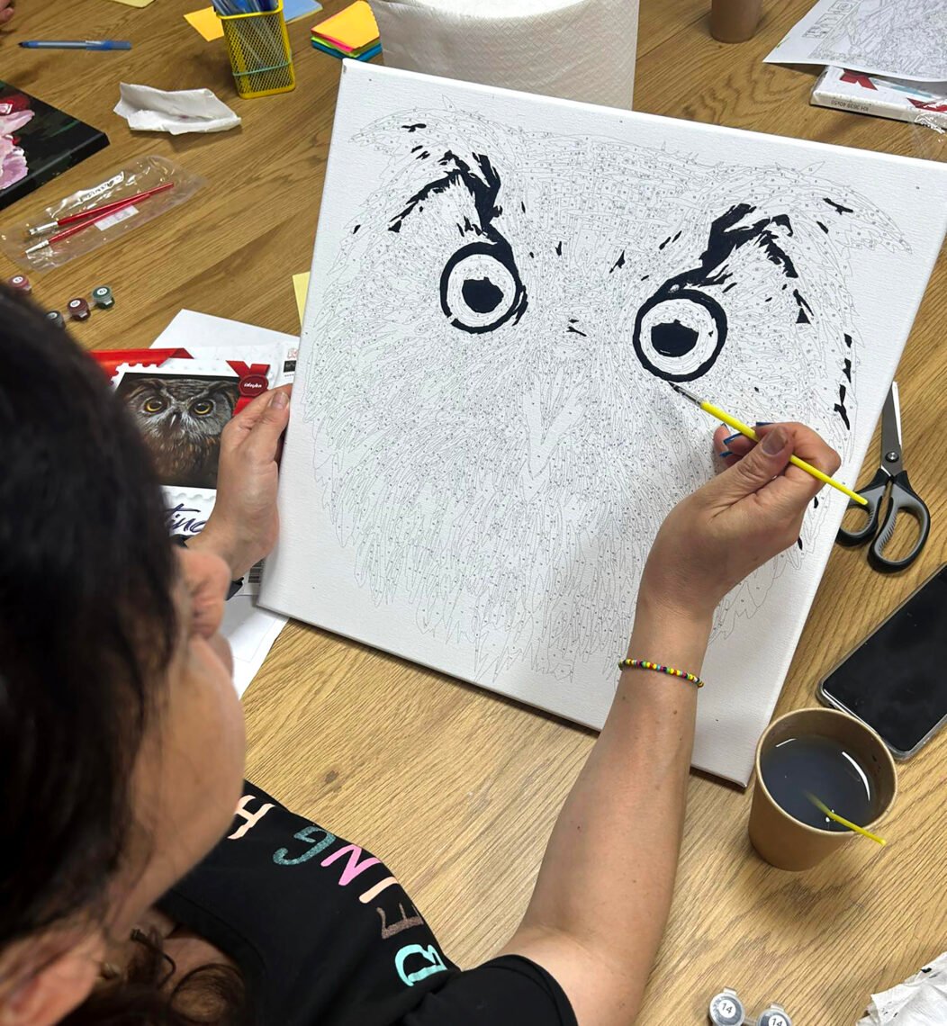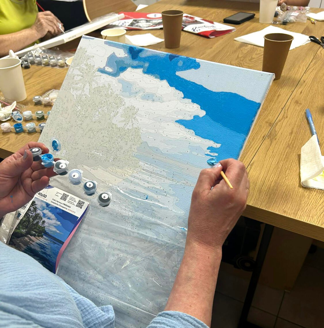 Чергове заняття з малювання відбулося у «Жіночому клубі» Маріупольської Асоціації Жінок «Берегиня». Малювання картин відбувалося не само по собі – з жінками працювала досвідчена фахівчиня. Тож цікава вправа мала ще й лікувальний ефект. Учасниці не тільки зосереджено малювали картини за номерами, що потребує не аби якої уваги, а й гарно спілкувалися, ділилися досвідом, переживаннями й отримували підтримку. Вгамовували стрес, негативні емоції, тренували увагу та дрібну моторику.