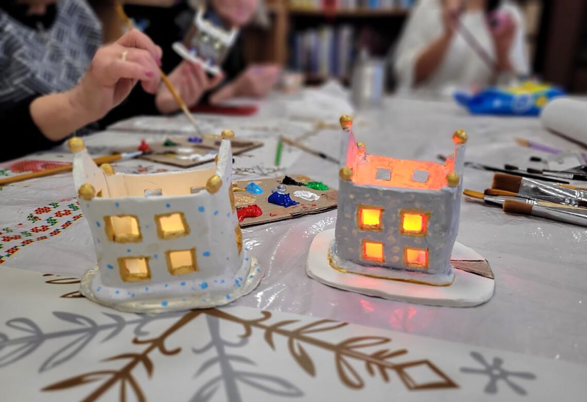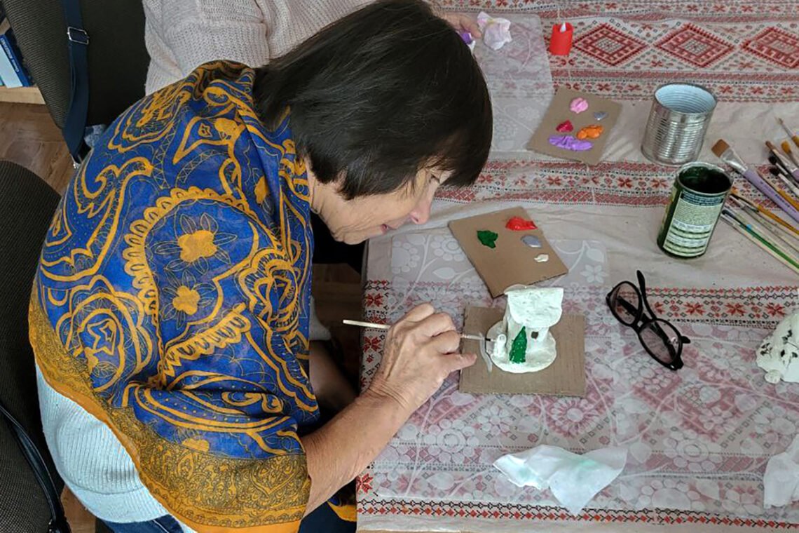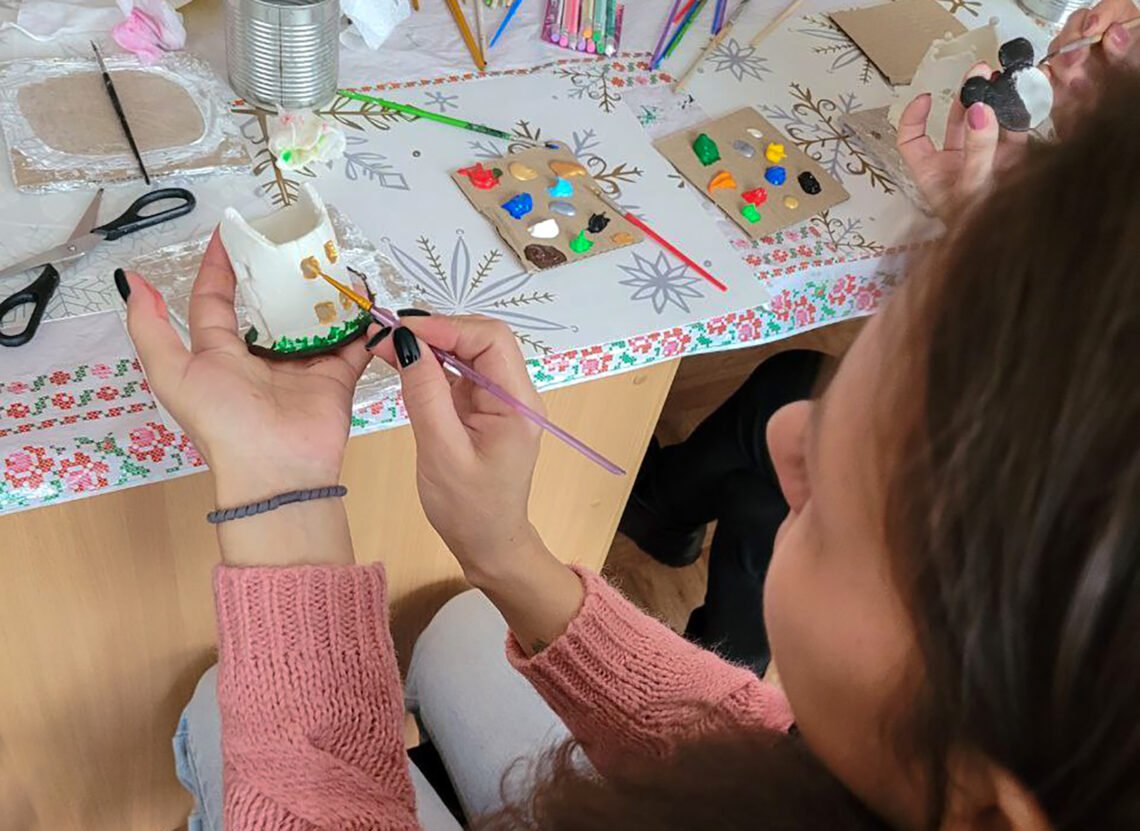 На заняттях з арт-терапії ми кожного разу намагаємось налаштувати жінок на позитив, адже створюючи якісь дрібнички, картини, листівки, іграшки чи малюнки, працюючи з різними матеріалами та техніками, наші учасниці не тільки розкривають свій творчий потенціал, а й контролюють емоційний стан. Сьогодні майстрували цегляний свічник у формі дому, розмальовували його у кольори щастя.