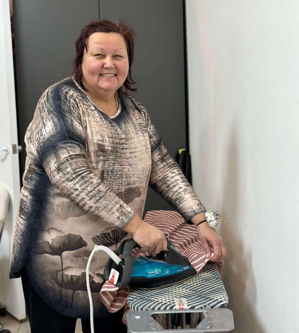 «З першого заняття ми занурились у роботу. Пані Мар’яна, майстриня, яка викладала нам шиття, одразу ж почала навчати нас як знімати мірки, робити викройки, обробляти тканини. Практика була водночас з навчанням. Ми почали з нескладних речей – шили сумки-шопери та наволочки. Одразу ж йшло пояснення про види швів, варіантів вшиття блискавок, навчання роботи на оверлочній машині. Потім завдання ставали складнішими. Під час навчання всі пошили собі штани, спідниці, сарафани та жилети. Мій досвід у шитті невеликий – можу щось перешити, зробити дрібний ремонт. Два роки тому син подарував мені машинку, я вчилася шити у ютубі. Це допомагало, бо щось з речей візьмеш з гуманітарки, а воно тобі не підходить за розміром. Знання та вміння, отримані на курсах, дуже знадобилися. З того, що викладали, я застосовувала вдома, закріплювала знання, так би мовити»