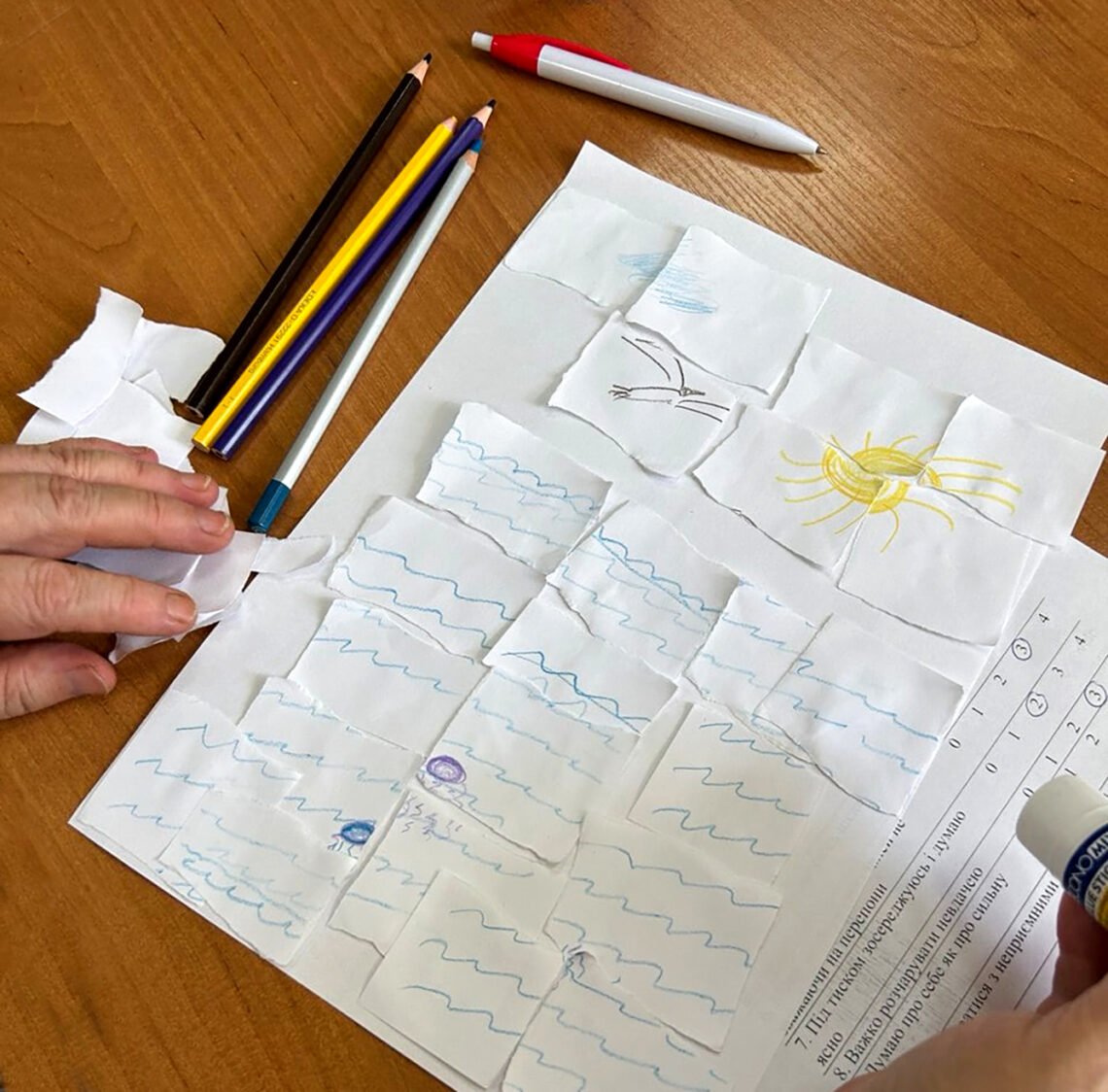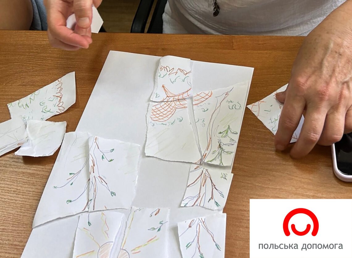 Саме за таким принципом, із метою прийняття власних «тріщин», спричинених війною та втратами, психологи Маріупольська Асоціація Жінок Берегиня провели арт-терапевтичне заняття з жінками ВПО. Замість чашок були малюнки, які учасниці створили власноруч. Згодом кожна з них розірвала свій малюнок на шматки, а потім склеїла його знову.