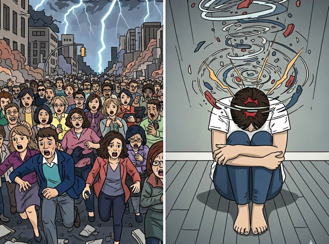Паніка – це природна реакція організму на реальну небезпеку. Коли ми бачимо загрозу (наприклад, обстріл, пожежу чи ДТП), організм миттєво мобілізується: серце б’ється швидше, м’язи напружуються, свідомість фокусується на виживанні. Паніка триває кілька хвилин, поки триває загроза. І її мета – мобілізувати сили, щоб вижити.